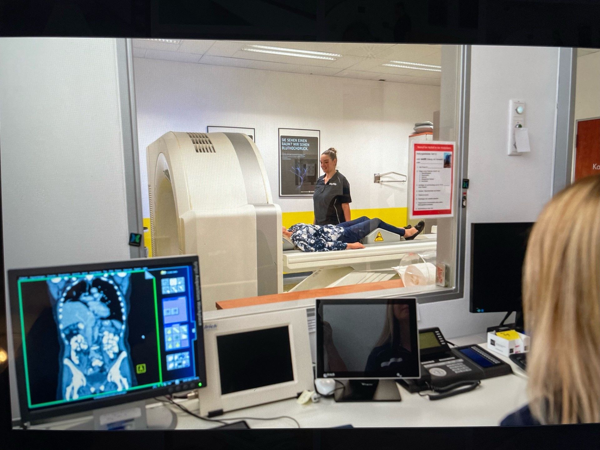 Die neueste Generation der Computertomographen, wie auch unsere Geräte, sind die Spiral-CTs. Sie nehmen die Schnittbilder nicht einzeln nacheinander auf, sondern fortlaufend. Durch diese Technik werden die CT-Bilder wesentlich schneller aufgenommen und außerdem die Strahlendosis reduziert.